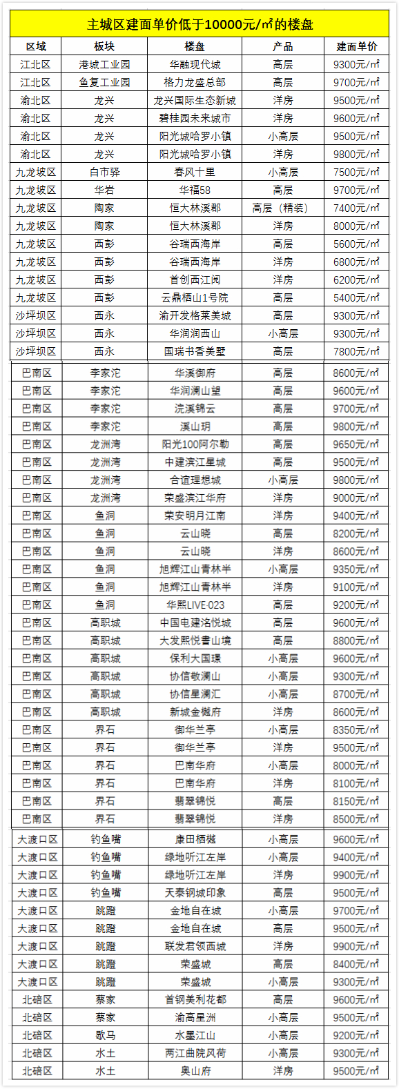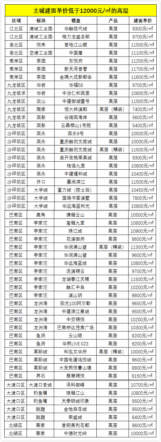 銘騰發(fā)布的數據顯示,7月份重慶主城區296個(gè)主力在售項目中,建面單價(jià)低于1萬(wàn)的項目只有57個(gè)。