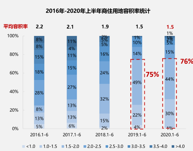 而今年上半年,容積率1.0-2.0的土地占了76%的成交比例。其中,容積率1.0-1.5的土地的成交比例同比去年還上升了8個(gè)百分點(diǎn),達到30%。