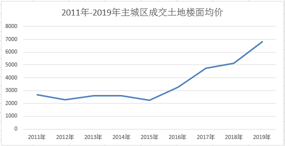 2016年—2019年,這五年的地價(jià)可以用“猛”來(lái)形容。從2015年的2237元/㎡到2019年的6825元/㎡,地價(jià)漲了3.05倍。