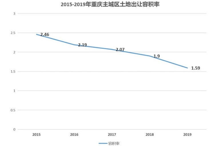 2015年以前,主城成交土地容積率高的時(shí)候,隨處可見(jiàn)高層。2015年以后,成交土地容積率一降再降,到了2019年,只有1.59。