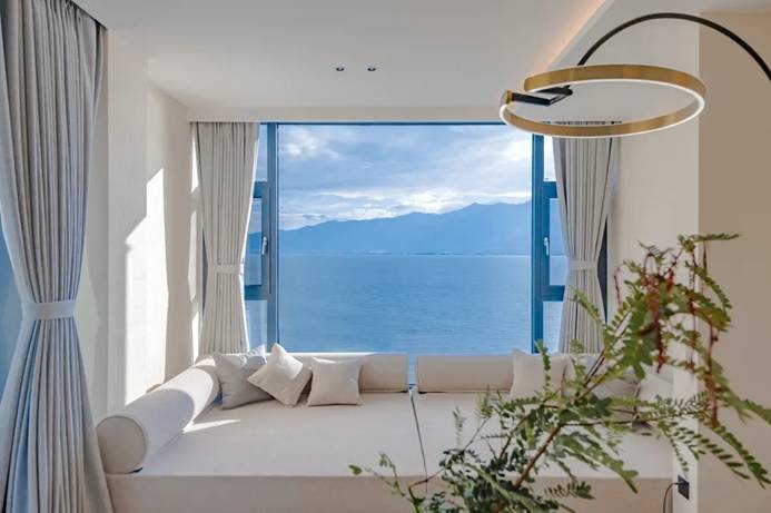 酒店的核心魅力,始于無(wú)可復制的自然視野。依山而建的建筑順勢融入懸崖肌理,與碧波萬(wàn)頃的洱海無(wú)縫銜接,推窗即見(jiàn)蒼山如黛、洱海如鏡,“蒼山雪、洱海月”的千古意境成為日常窗景。清晨,看朝陽(yáng)躍出海面,將碧波染成金箔;日暮,賞晚霞漫過(guò)天際,讓波光載著(zhù)余暉;夜晚,枕著(zhù)輕柔海浪聲入眠,星光與漁火在水面交織,每一刻都是與自然的深情對話(huà)。